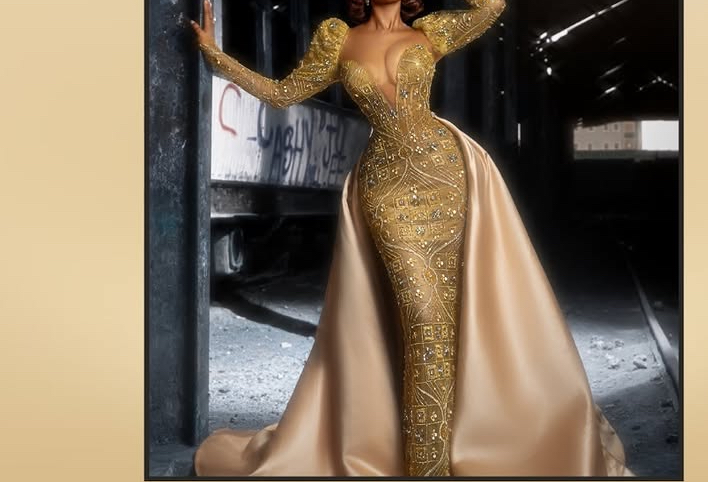 This dress was inspired by the legendary Queen of Sheba. This elegant dress drapes in opulent gold satin