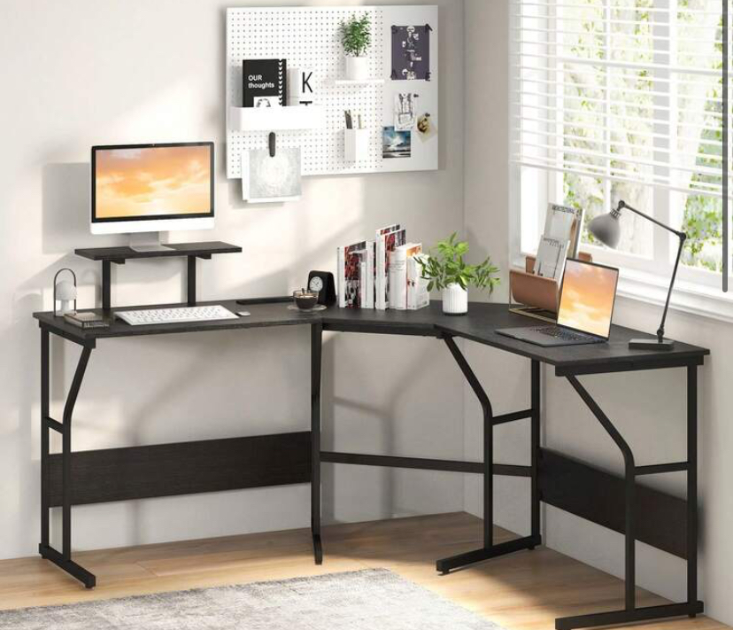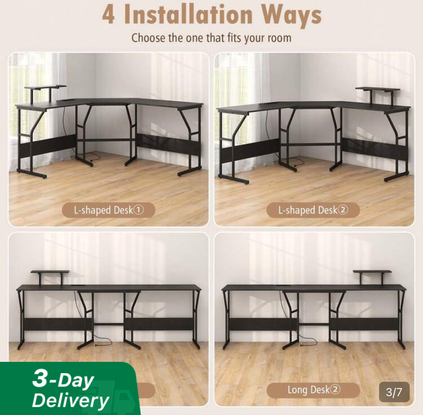 Goflame L shaped desk with built in power station. Corner computer desk with moveable monitor stand