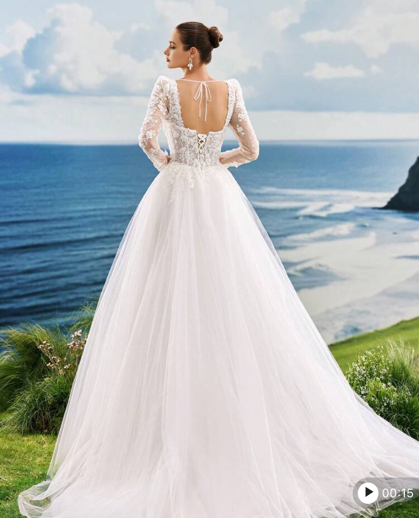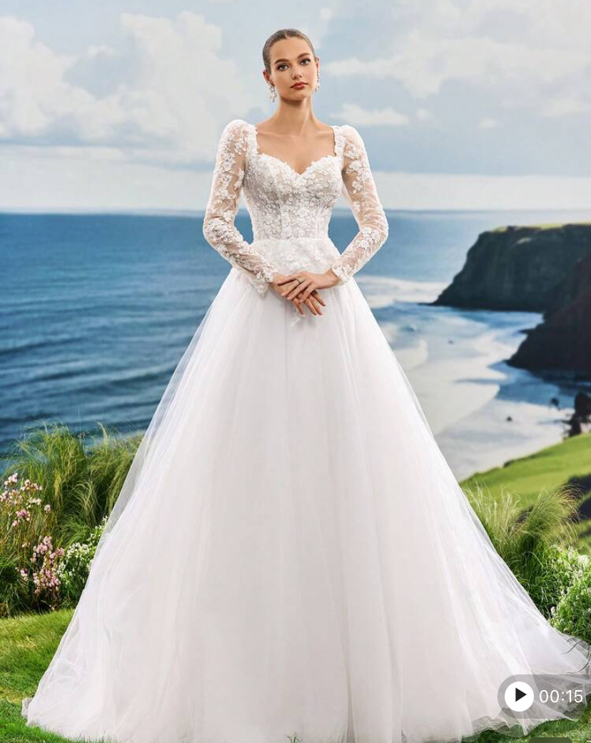 Sweetheart neck long sleeve high end pearl embroidered lace heart shaped collar wedding gown